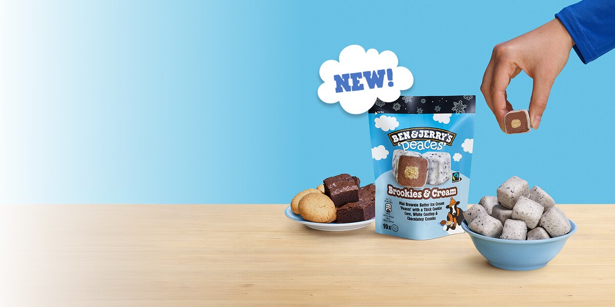Brownies, tick. Cookies, tick. Brookies inspired ice cream in snackable Peaces? BIG TICK! Brownie batter ice cream Peaces with a thick cookie core, covered in a white coating and chocolatey crumbs, they're snack-sized Peaces of ice cream euphoria that are perfect for sharing - or keeping all to yourself. Enjoy anytime, anywhere!